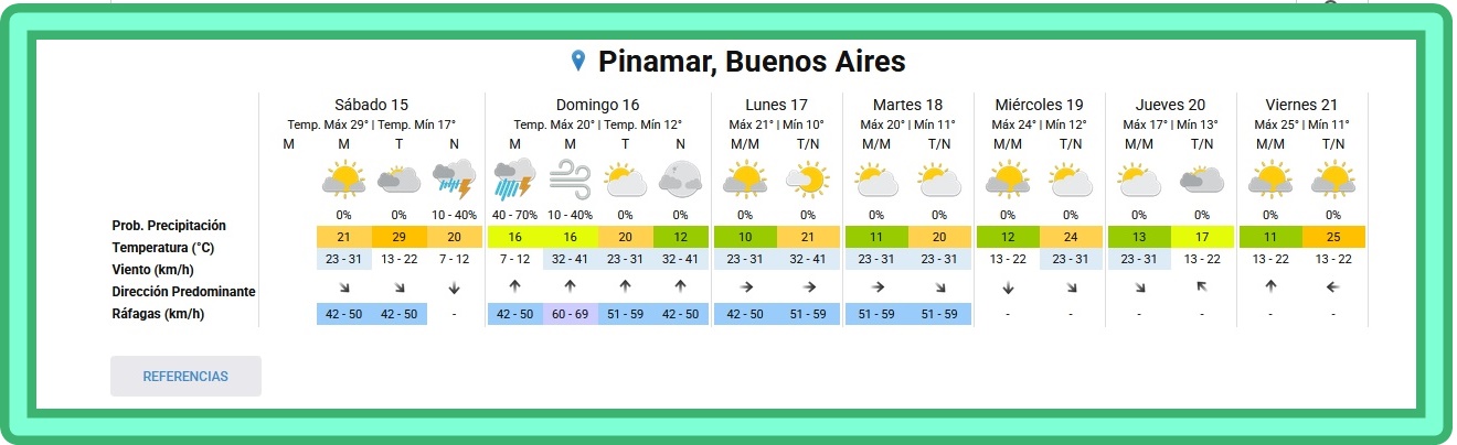 EL TIEMPO EN PINAMAR PARA ESTE SÁBADO 15 DE NOVIEMBRE Y PROYECCIÓN PARA LOS PRÓXIMOS 6 DÍASDespejado - Humedad: 88 % Presión: 1012.1 hPa Viento: Noroeste a 6 km/h Visibilidad: 10 km Sol: 05:29 Puesta de Sol: 19:36 ECONOMÍA
