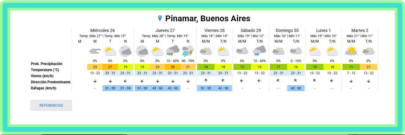EL TIEMPO EN PINAMAR PARA ESTE MIÉRCOLES 26 DE NOVIEMBRE Y PROYECCIÓN PARA LOS PRÓXIMOS 6 DÍASLigeramente nublado - Humedad: 92 % Presión: 1014.5 hPa Viento: Este a 12 km/h Visibilidad: 10 km Sol: 05:23 Puesta de Sol: 19:48 ECONOMÍA