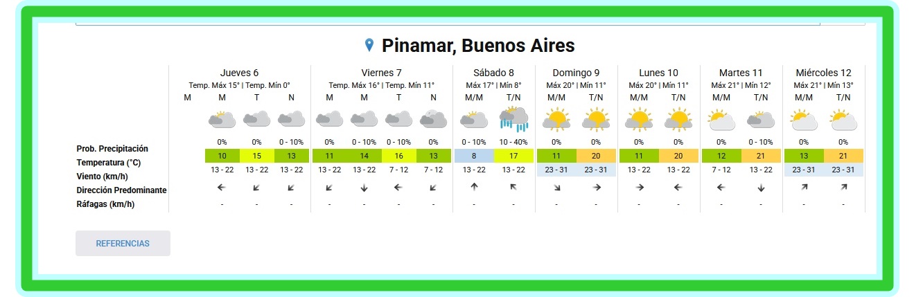 EL TIEMPO EN PINAMAR PARA ESTE JUEVES 6 DE NOVIEMBRE Y PROYECCIÓN PARA LOS PRÓXIMOS 6 DÍASAlgo nublado - Humedad: 75 % Presión: 1024.5 hPa Viento: Sur a 10 km/h Visibilidad: 10 km Sol: 05:36 Puesta de Sol: 19:27 NACIONALES