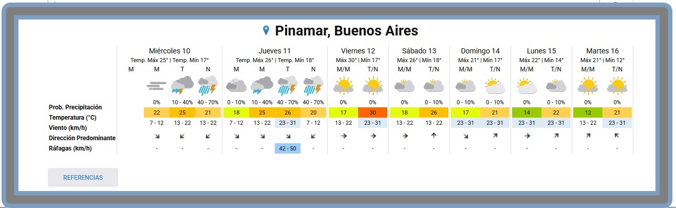 PRONÓSTICO DEL TIEMPO Y PROYECCIÓN PARA LOS PRÓXIMOS 6 DÍASNublado con probable precipitaciones - Humedad: 88 % Presión: 1002.2 hPa Viento: Norte a 6 km/h Visibilidad: 10 km Sol: 05:21 Puesta de Sol: 20:01 DEPORTES - FUENTE: AFA