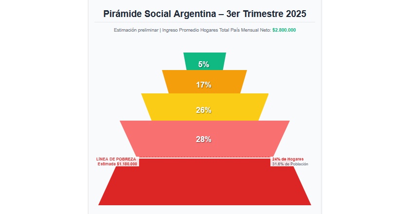 PIRÁMIDE SOCIAL: SE ACHICÓ LA POBREZA, PERO EL 50% EXPERIMENTA LA "CULTURA DEL NO" ....(NO HAY PLATA)Un informe sobre la composición de la pirámide social argentina reveló una leve mejoría en los estratos más bajos, pero confirmó la aguda dispersión en los patrones de consumo, con una marcada distancia entre la élite y la base que vive bajo la "cultura del ‘no’". El principal cambio detectado entre el segundo y tercer trimestre del año es el "ascenso" en la base de la pirámide: el estrato denominado “Clase baja, en pobreza” (hogares con ingresos menores a $1.18 millones mensuales) se achicó del 26% al 24% de la población. ....LEER MÁS .... PINAMAR