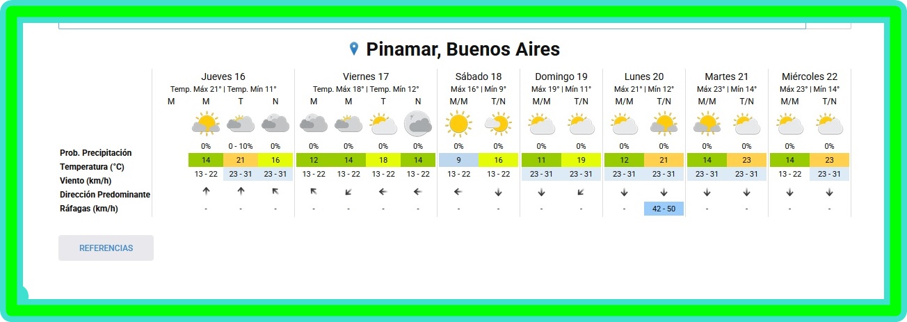EL TIEMPO EN PINAMAR PARA ESTE VIERNES 17 DE OCTUBRE Y PROYECCIÓN PARA LOS PRÓXIMOS 6 DÍASAlgo nublado - Humedad: 94 % Presión: 1013.6 hPa Viento: Norte a 8 km/h Visibilidad: 10 km Sol: 06:00 Puesta de Sol: 19:06 PINAMAR