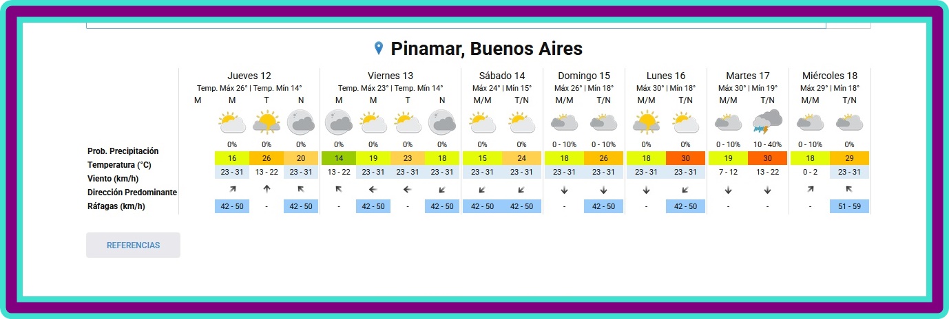 PRONÓSTICO DEL TIEMPO EN PINAMAR PARA ESTE VIERNES 13 Y PROYECCIÓN PARA LOS PRÓXIMOS 6 DÍASLigeramente nublado - Humedad: 67 % Presión: 1011.8 hPa Viento: Sur a 25 km/h Visibilidad: 10 km Sol: 06:16 Puesta de Sol: 19:47 NACIONALES