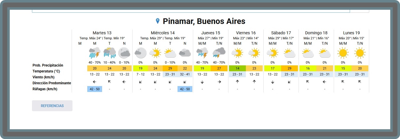 PRONÓSTICO DEL TIEMPO EN PINAMAR PARA ESTE MARTES 13 Y PROYECCIÓN PARA LOS PRÓXIMOS 6 DÍASNublado con lluvias durante las primeras horas del día - Humedad: 75 % Presión: 1010.6 hPa Viento: Sur a 13 km/h Visibilidad: 10 km Sol: 05:42 Puesta de Sol: 20:10 PROVINCIA DE BUENOS AIRES (SANTA CLARA DEL MAR)