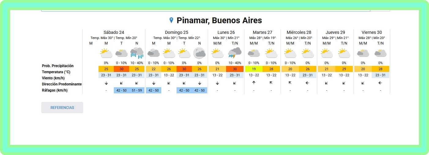 PRONÓSTICO DEL TIEMPO EN PINAMAR PARA ESTE SÁBADO 24 Y PROYECCIÓN PARA LOS PRÓXIMOS 6 DÍASLigeramente nublado - Humedad: 83 % Presión: 1015.6 hPa Viento: Norte a 15 km/h Visibilidad: 10 km Sol: 05:54 Puesta de Sol: 20:05 ESPACIO DE PUBLICIDAD