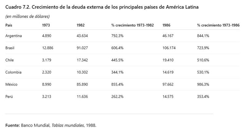 Tanto el abandono del patrón oro por parte de Estados Unidos en 1971 y la invasión de petrodólares, a raíz de en un fenomenal aumento de los precios de los combustibles y en fuertes restricciones para su consumo, aumentó fuertemente la liquidez global y los países productores comenzaron a ofrecer préstamos a granel, sobre todo a los países de la periferia, que hicieron explotar las monumentales deudas externas. América Latina accedía, entonces, a deuda barata en dólares para financiar déficits ante bajos precios en commodities.