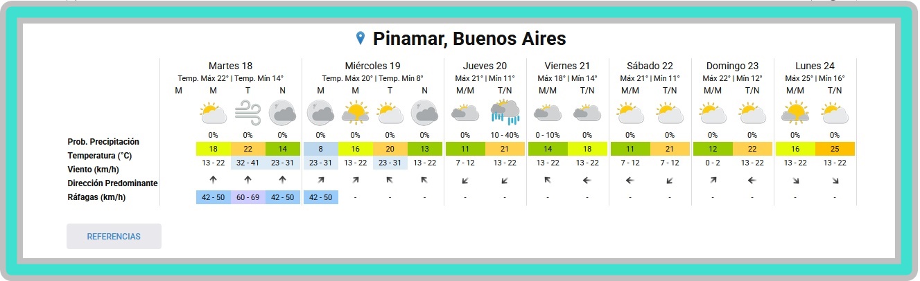 EL TIEMPO EN PINAMAR PARA ESTE MARTES 18 DE NOVIEMBRE Y PROYECCIÓN PARA LOS PRÓXIMOS 6 DÍASAlgo nublado - Humedad: 68 % Presión: 1003.6 hPa Viento: Oeste a 13 km/h Visibilidad: 10 km Sol: 05:27 Puesta de Sol: 19:40 DEPORTES