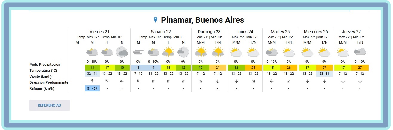 EL TIEMPO EN PINAMAR PARA ESTE VIERNES 21 DE NOVIEMBRE Y PROYECCIÓN PARA LOS PRÓXIMOS 6 DÍASAlgo nublado - Humedad: 95 % Presión: 1007.2 hPa Viento: Este a 4 km/h Visibilidad: 10 km Sol: 05:25 Puesta de Sol: 19:43 DEPORTES
