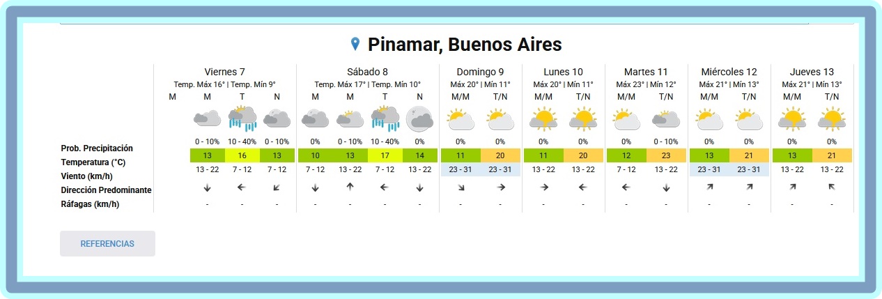 EL TIEMPO EN PINAMAR PARA ESTE VIERNES 7 DE NOVIEMBRE Y PROYECCIÓN PARA LOS PRÓXIMOS 6 DÍASNublado - Humedad: 85 % Presión: 1018.8 hPa Viento: Este a 4 km/h Visibilidad: 10 km Sol: 05:35 Puesta de Sol: 19:28 NACIONALES