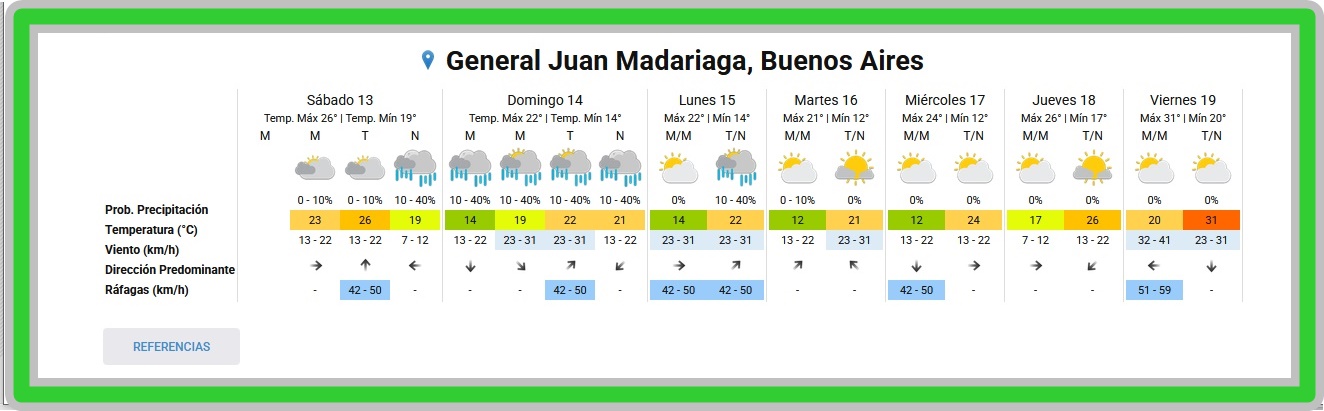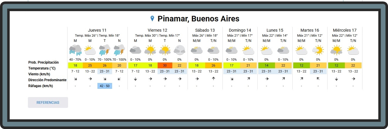 PRONÓSTICO DEL TIEMPO Y PROYECCIÓN PARA LOS PRÓXIMOS 6 DÍASLigeramente nublado - Humedad: 80 % Presión: 996.2 hPa Viento: Norte a 10 km/h Visibilidad: 15 km Sol: 05:23 Puesta de Sol: 20:03 POLÍTICA