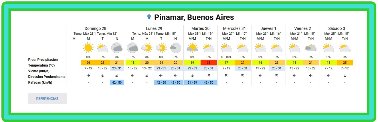 PRONÓSTICO DEL TIEMPO Y PROYECCIÓN PARA LOS PRÓXIMOS 6 DÍASLigeramente nublado - Humedad: 77 % Presión: 1011 hPa Viento: Sudeste a 8 km/h Visibilidad: 10 km Sol: 05:28 Puesta de Sol: 20:10 DEPORTES
