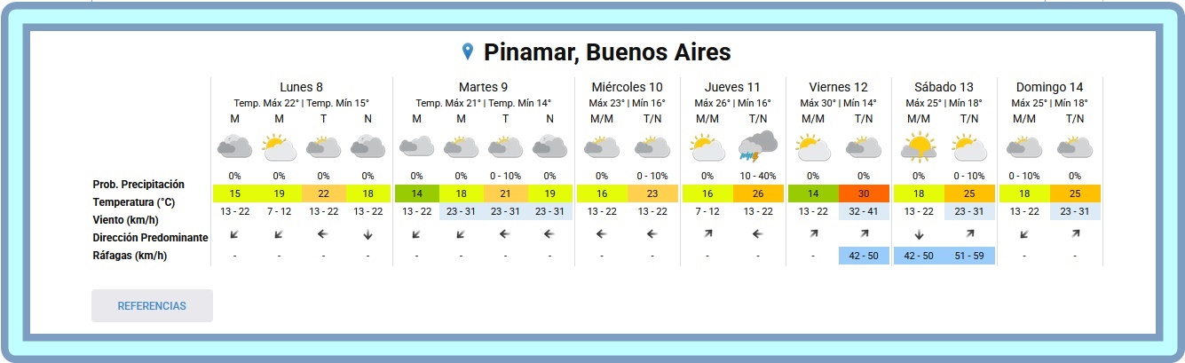 PRONÓSTICO DEL TIEMPO Y PROYECCIÓN PARA LOS PRÓXIMOS 6 DÍASParcialmente nublado - Humedad: 85 % Presión: 1019.3 hPa Viento: Este a 6 km/h Visibilidad: 12 km Sol: 05:21 Puesta de Sol: 19:59 SOCIEDAD