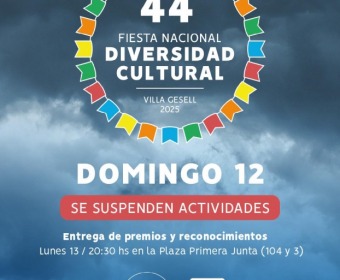 POR CUESTIONES CLIMÁTICAS, SE SUSPENDIÓ LA CUARTA Y ÚLTIMA JORNADA DE LA FIESTA DE LA DIVERSIDAD CULTURALDebido a las inclemencias climáticas y ante el pronóstico de lluvias para el resto del día, la Municipalidad anunció la suspensión de los espectáculos previstos en los escenarios, así como el funcionamiento del patio gastronómico y artesanal. ..LEER MÁS ... GENERAL MADARIAGA