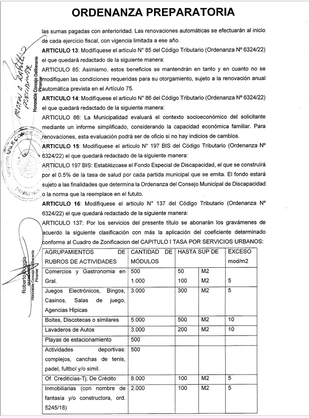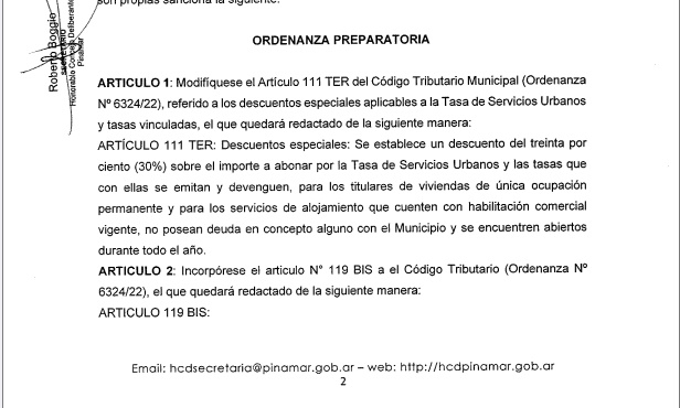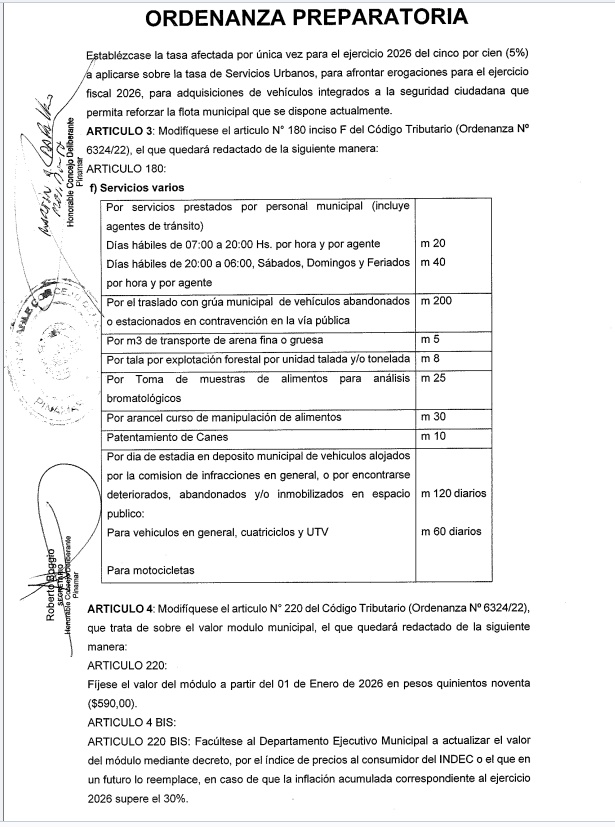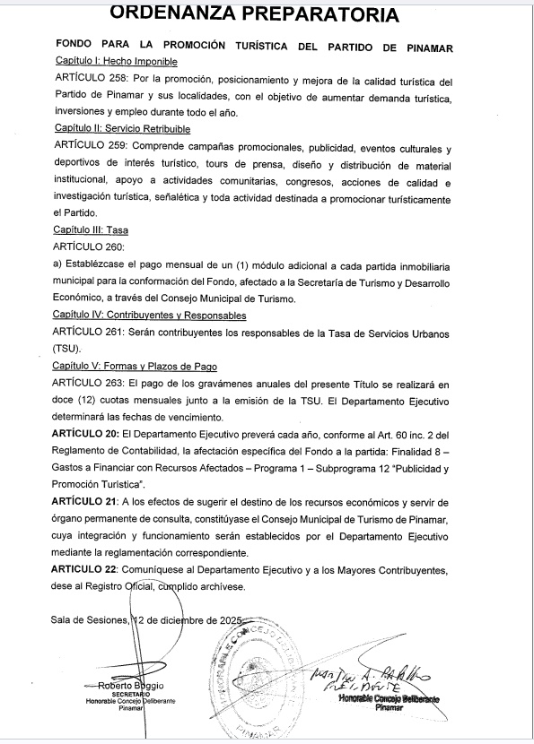 EL GOBIERNO DE PINAMAR ENVÍO AL H.C.D. LA ORDENANZA PREPARATORIA PARA EL AUMENTO DE TASAS MUNICIPALESEl Concejo Deliberante de Pinamar procedió al llamado de Mayores Contribuyentes para avanzar con la Ordenanza Preparatoria enviada por el ejecutivo para disponer un aumento de tasas municipales que entre otras disposiciones establecerá el valor del módulo en $ 560.- a partir del 1º de enero de 2026.- Independientemente de ese aumento, el artículo 220 BIS faculta al ejecutivo a actualizar el valor mediante Decreto por el índice de precios al consumidor (INDEC) en caso de que la inflación acumulada en 2026 supere el 30%. Cómo dato ilustrativo señalamos el gobierno local durante todo el 2025 actualizó los valores por el IPC, pero ahora se desayunó con la realidad de que "la economía real" va por otro carril respecto del IPC del gobierno nacional y que el aumento de los insumos y demás gastos corrientes del municipio no guardan relación con el mismo. ....LEER MÁS Y VER GALERÍA DE IMÁGENES DE TODO EL PROYECTO .... INTERNACIONALES