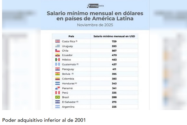 ARGENTINA TIENE EL SALARIO MÍNIMO EN DÓLARES MÁS BAJO DE LA REGIÓNLa promesa del presidente Javier Milei, realizada en noviembre de 2023 cuando era electo, de que "en 2025 los salarios en dólares van a volar", no solo no se cumplió, sino que los ingresos de los trabajadores se desplomaron a niveles históricos. seguran que el gobierno de Javier Milei utilizó el sueldo de los trabajadores "como ancla del ajuste y la desaceleración de la inflación". Un informe del Centro Estratégico Latinoamericano de Geopolítica (Celag) reveló que, actualizado a noviembre de 2025, el salario mínimo de Argentina es el más bajo de toda la región. ...LEER MÁS ... ECONOMÍA