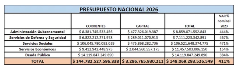 CÓMO DIMENSIONAR EL AJUSTE: UNA COMPARACIÓN REAL DEL PRESUPUESTO 2026 CON EL DE 2023El último presupuesto aprobado por el Congreso de la Nación fue el de 2023. Para los años 2024 y 2025, el Poder Ejecutivo administró los recursos públicos mediante prórrogas. Todos los 15 de septiembre, el Ejecutivo, a través del Ministerio de Economía, envía al Congreso de la Nación el Proyecto de Ley de Presupuesto General de la Administración Nacional para el ejercicio fiscal del año siguiente. Tras dos períodos de incumplimiento, esta vez el Gobierno nacional envió el proyecto tal como lo establece la Ley Nº 24.156 de Administración Financiera. ...LEER MÁS ... POLÍTICA