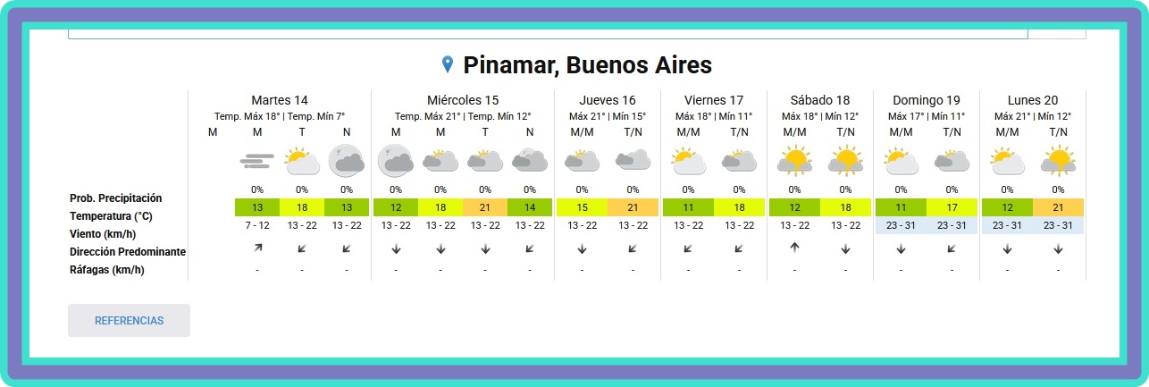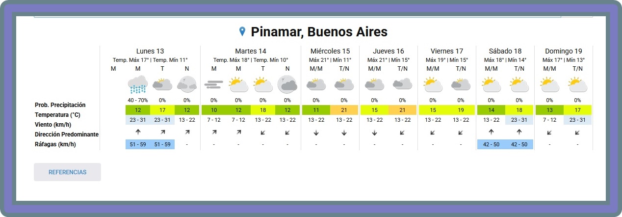 EL TIEMPO EN PINAMAR PARA ESTE LUNES 13 DE OCTUBRE Y PROYECCIÓN PARA LOS PRÓXIMOS 6 DÍASCubierto mejorando hacia la tarde - Humedad: 98 % Presión: 1002.4 hPa Viento: Sur a 34 km/h Visibilidad: 8 km Sol: 06:05 Puesta de Sol: 19:03 SOCIEDAD