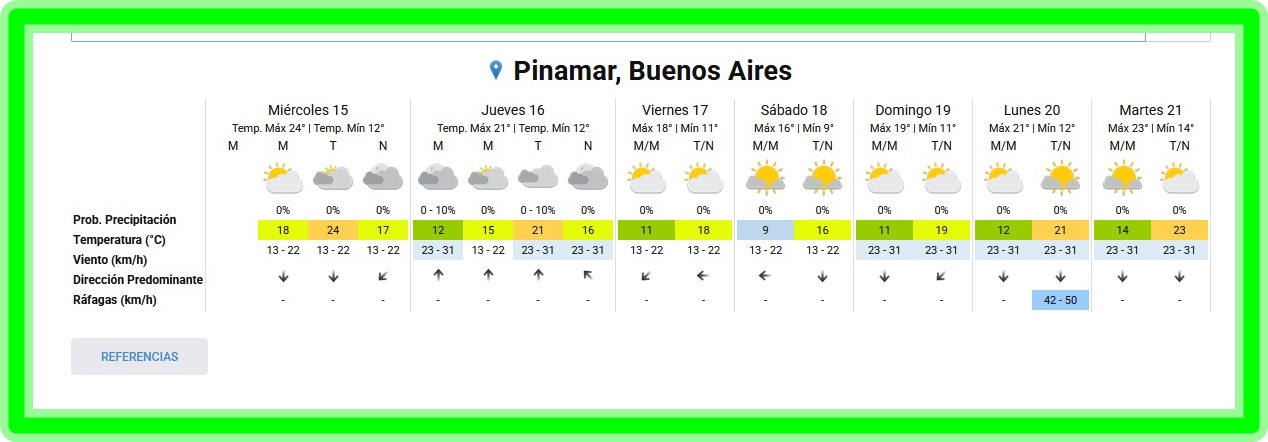 EL TIEMPO EN PINAMAR PARA ESTE MIÉRCOLES 15 DE OCTUBRE Y PROYECCIÓN PARA LOS PRÓXIMOS 6 DÍASParcialmente nublado - Humedad: 81 % Presión: 1014.8 hPa Viento: Norte a 13 km/h Visibilidad: 10 km Sol: 06:02 Puesta de Sol: 19:05 PROVINCIA DE BUENOS AIRES (MINISTERIO DE TRABAJO)
