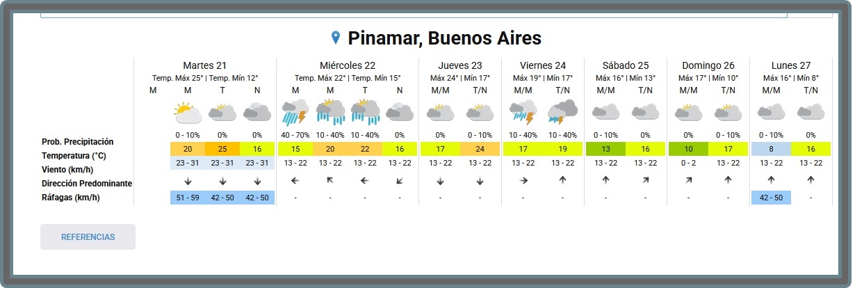 EL TIEMPO EN PINAMAR PARA ESTE MARTES 21 DE OCTUBRE Y PROYECCIÓN PARA LOS PRÓXIMOS 6 DÍASMayormente nublado - Humedad: 77 % Presión: 1019.8 hPa Viento: Norte a 19 km/h Visibilidad: 12 km Sol: 05:54 Puesta de Sol: 19:10 DEPORTES