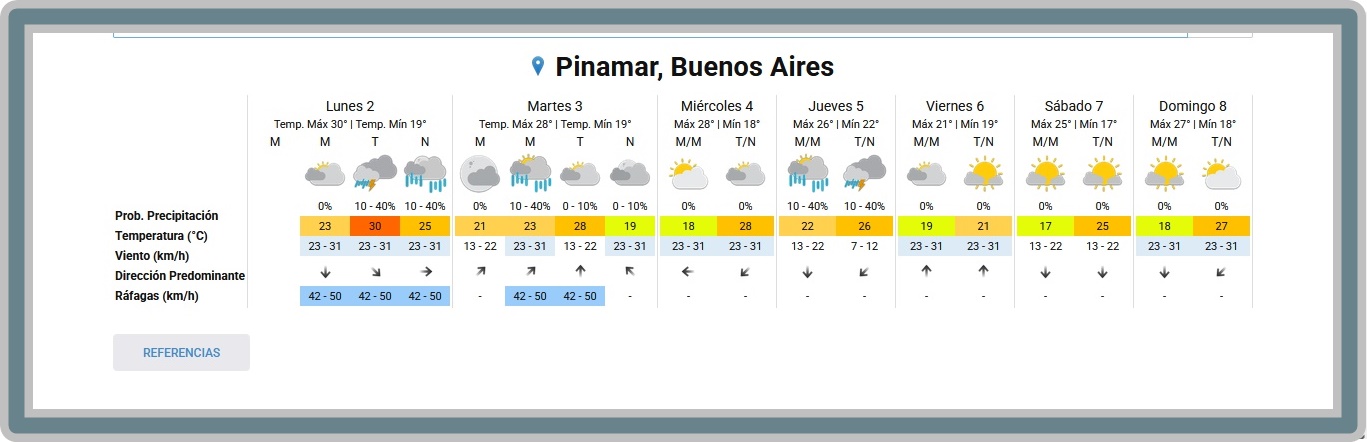 PRONÓSTICO DEL TIEMPO EN PINAMAR PARA ESTE LUNES 2 Y PROYECCIÓN PARA LOS PRÓXIMOS 6 DÍASMayormente nublado - Humedad: 92 % Presión: 1006.2 hPa Viento: Norte a 10 km/h Visibilidad: 12 km Sol: 06:04 Puesta de Sol: 19:58 NACIONALES