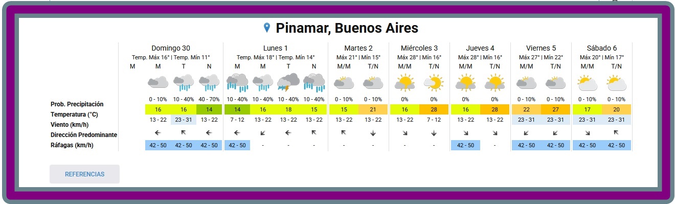 EL TIEMPO EN PINAMAR PARA ESTE DOMINGO 30 DE NOVIEMBRE Y PROYECCIÓN PARA LOS PRÓXIMOS 6 DÍASAlgo nublado - Humedad: 85 % Presión: 1015.2 hPa Viento: Este a 15 km/h Visibilidad: 10 km Sol: 05:21 Puesta de Sol: 19:52 DEPORTES