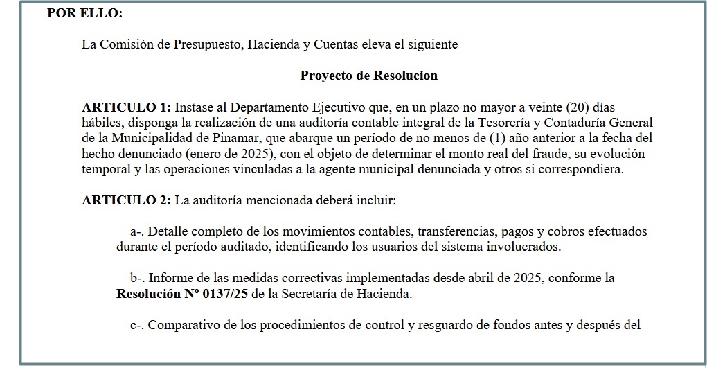 El Concejo Deliberante aprobó un Proyecto de Resolución, (Expediente Nº 4123-2796/2025 Cpo. 2 -) respecto del hecho de administración fraudulenta en la tesorería municipal de Pinamar, estimado en al menos $67.341.690, instando al Departamento Ejecutivo para que en un plazo no mayor a veinte (20) días hábiles, disponga la realización de una auditoría contable integral de la Tesorería y Contaduría General que abarque un período de no menos de (1) año anterior a la fecha del hecho denunciado (enero de 2025), con el objeto de determinar el monto real del fraude, su evolución temporal y las operaciones vinculadas a la agente municipal denunciada, Norma Beatriz Watson, y otros responsables si correspondiera. ....LEER MÁS ....
