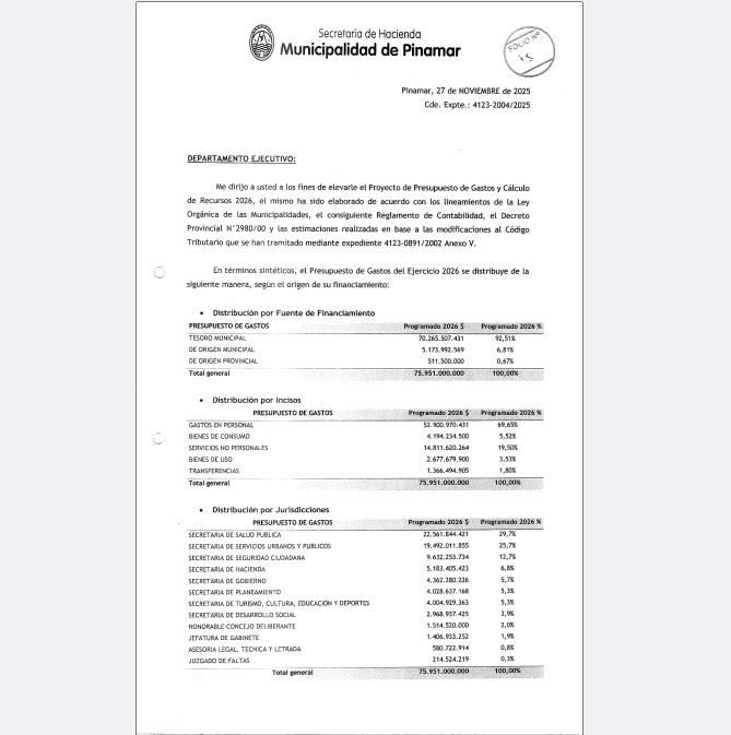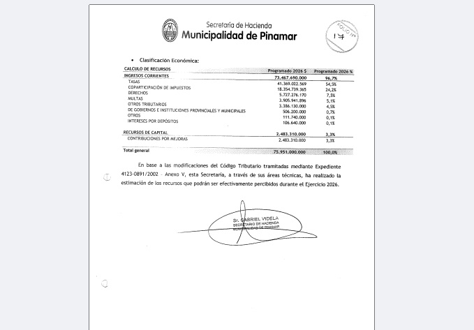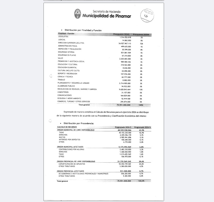 EL PRESUPUESTO DE GASTOS Y CÁLCULO DE RECURSOS DEL 2026 EN PINAMAR ASCIENTE A $ 75.951.000.000.-