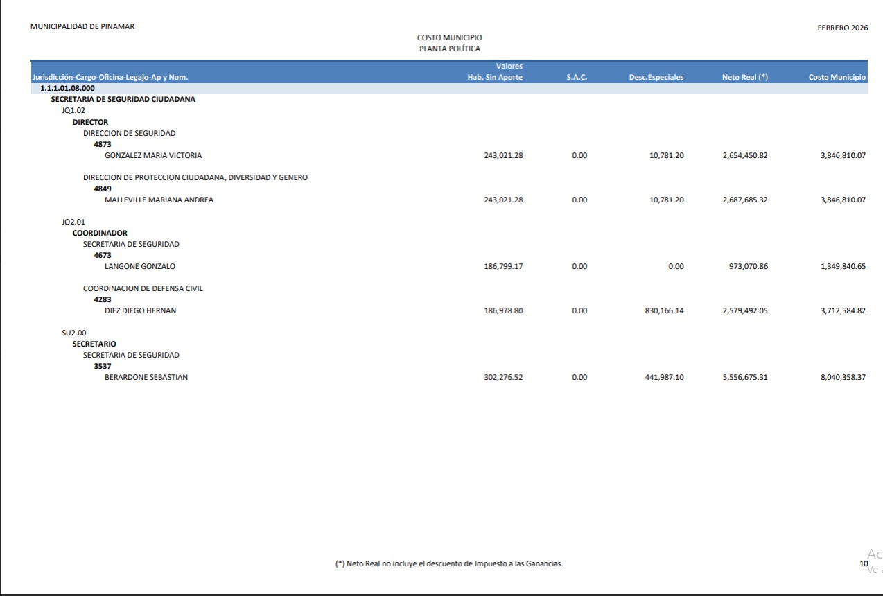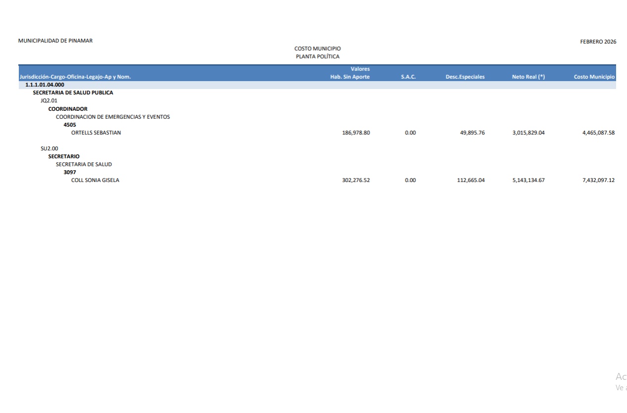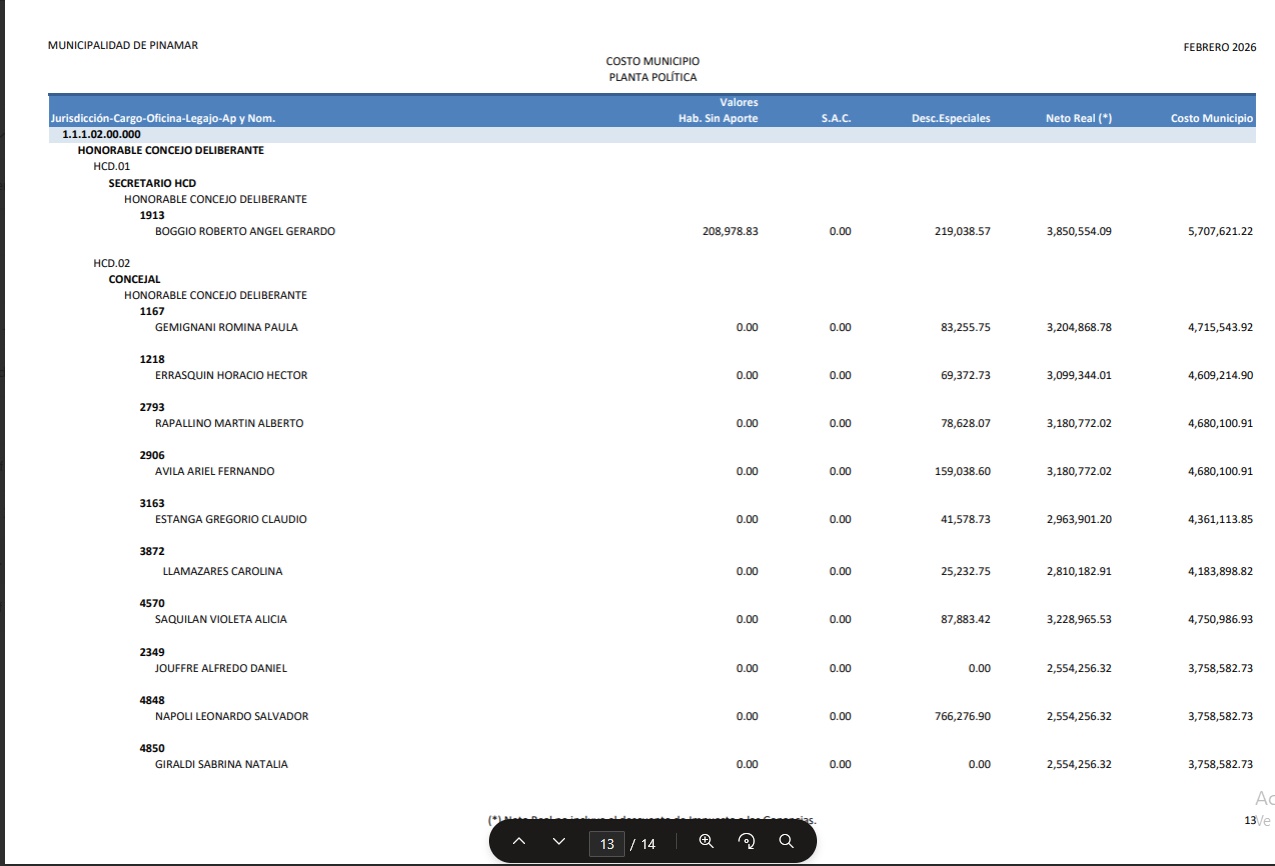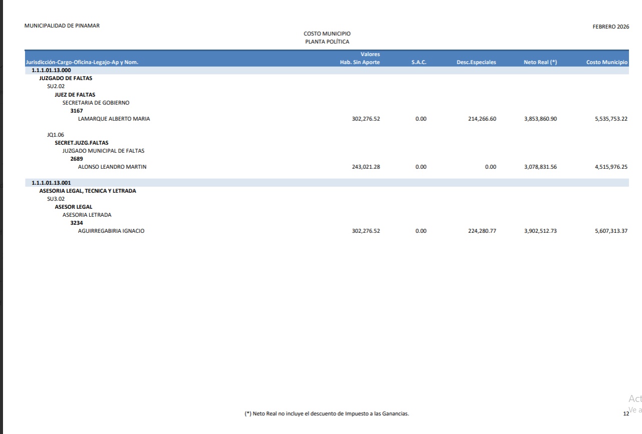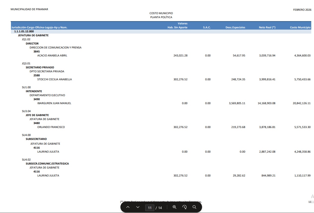 En artículo publicado en la fecha damos cuenta de cómo el gobierno nacional actualizó en más de un 100% los sueldos de funcionarios. Así observamos que un ministro pude llegar a percibir unos $ 7.100.000.- ¿Pero que ocurre mientras tanto en Pinamar?. Bueno de acuerdo a lo publicado en la página de la Municipalidad de Pinamar, los sueldos percibidos en el mes de febrero de 2026 por la “planta política” asciende a la suma de $ 336.897.919,92 Las 13 capturas de pantalla que podés observar haciendo “clic” en la imagen de este artículo, dan cuenta de cómo se distribuye esta cifra conforme al sueldo de cada funcionario. El dato más llamativo es el sueldo del Intendente Lic. Juan Manuel Ibarguren que percibió en febrero 2026 la suma de $ 20.842.126,11.- Todo esto ocurre cuando se observa la enorme debilidad que ofrece el municipio en términos de gestión para los vecinos, y en un contexto económico en el cual , no hace mucho tiempo, se hablaba de “declarar la emergencia económica”, con tasas indexadas durante todo el 2025, más un aumento del 40% adicional convalidado en diciembre de ese mismo año para equilibrar las cuentas municipales.