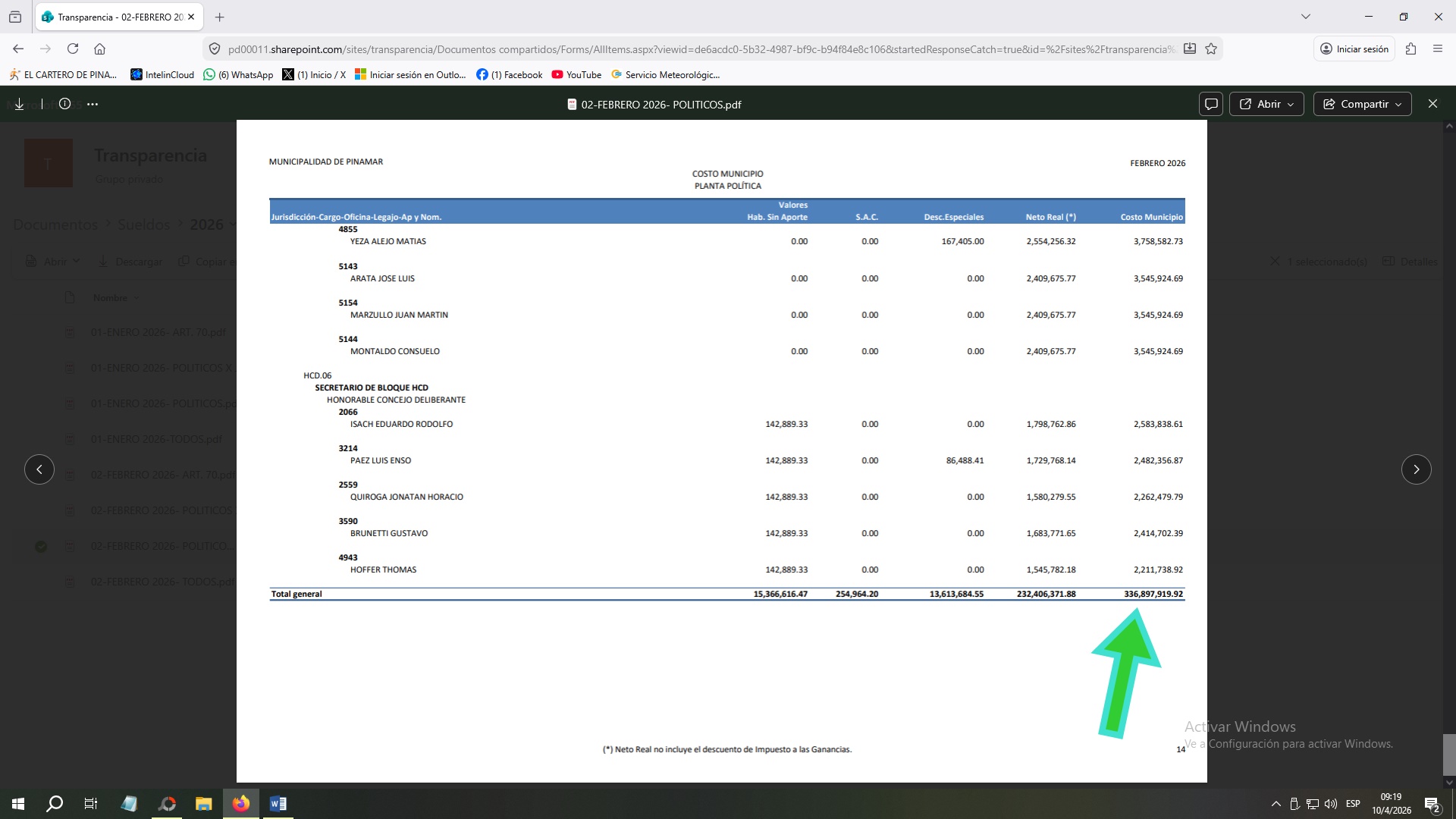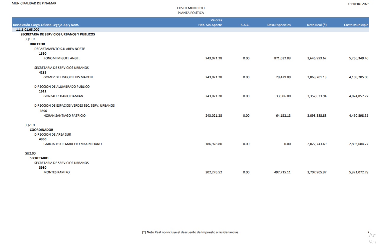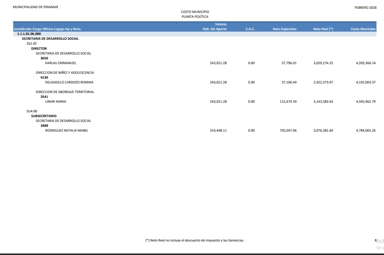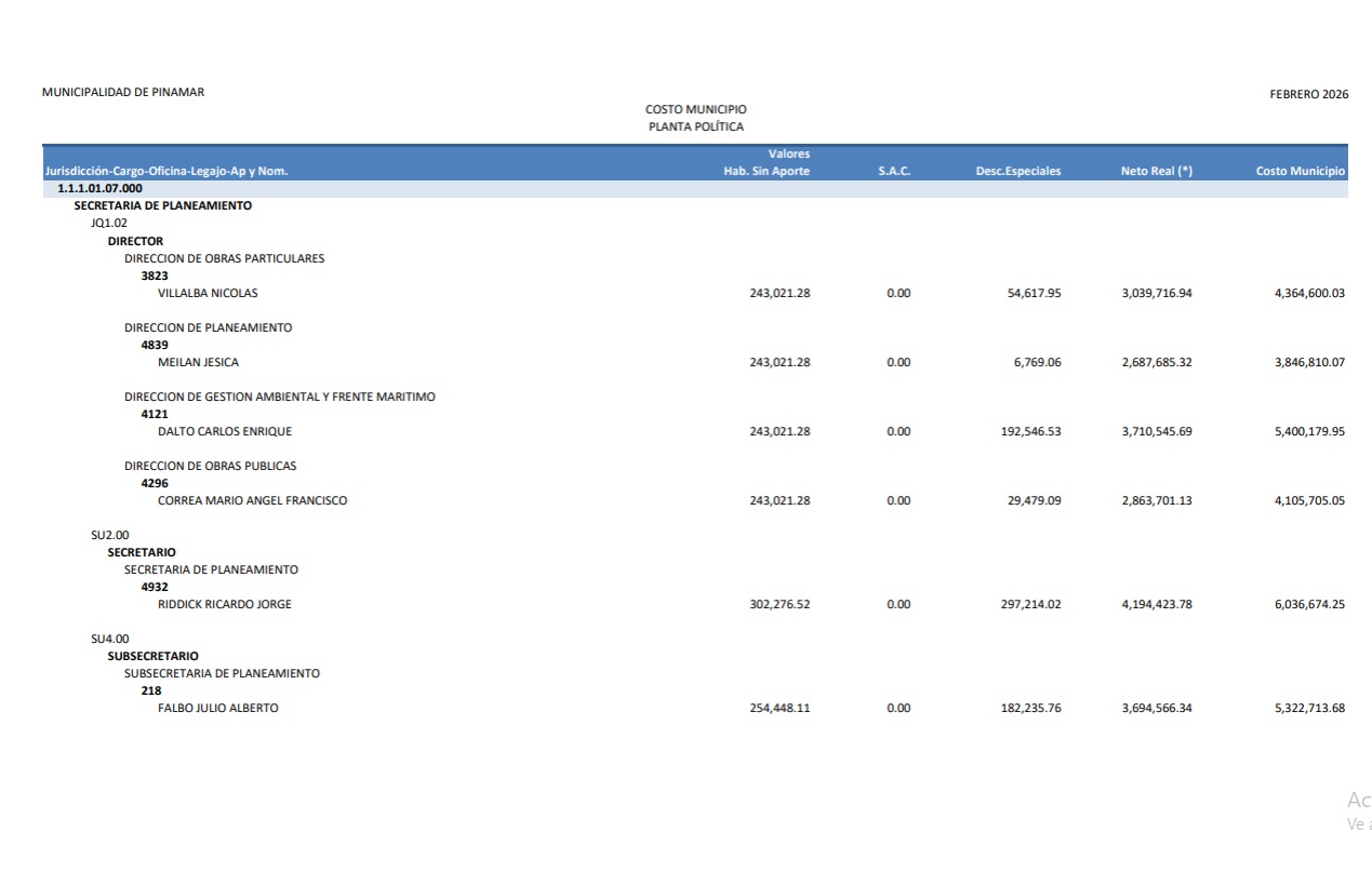 En artículo publicado en la fecha damos cuenta de cómo el gobierno nacional actualizó en más de un 100% los sueldos de funcionarios. Así observamos que un ministro pude llegar a percibir unos $ 7.100.000.- ¿Pero que ocurre mientras tanto en Pinamar?. Bueno de acuerdo a lo publicado en la página de la Municipalidad de Pinamar, los sueldos percibidos en el mes de febrero de 2026 por la “planta política” asciende a la suma de $ 336.897.919,92 Las 13 capturas de pantalla que podés observar haciendo “clic” en la imagen de este artículo, dan cuenta de cómo se distribuye esta cifra conforme al sueldo de cada funcionario. El dato más llamativo es el sueldo del Intendente Lic. Juan Manuel Ibarguren que percibió en febrero 2026 la suma de $ 20.842.126,11.- Todo esto ocurre cuando se observa la enorme debilidad que ofrece el municipio en términos de gestión para los vecinos, y en un contexto económico en el cual , no hace mucho tiempo, se hablaba de “declarar la emergencia económica”, con tasas indexadas durante todo el 2025, más un aumento del 40% adicional convalidado en diciembre de ese mismo año para equilibrar las cuentas municipales.