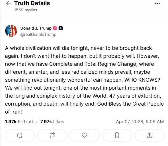 A poco más de cinco semanas del inicio de la guerra que enfrenta al eje Estados Unidos-Israel contra la República Islámica de Irán, el presidente Donald Trump lanzó una durísima amenaza contra el país persa. “Esta noche morirá toda una civilización, para no volver jamás”, aseguró Trump en Truth Social.